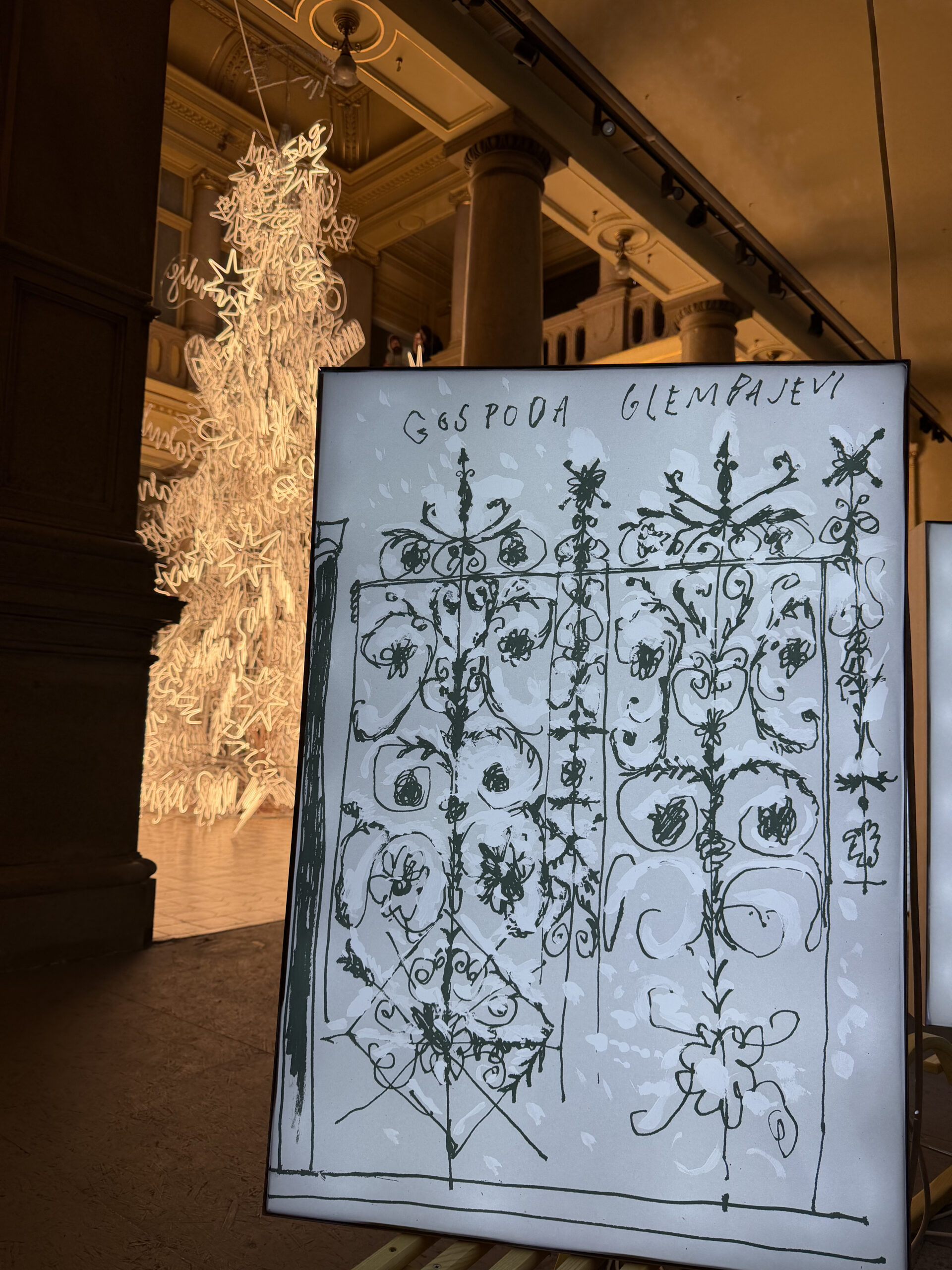 Ono što instalaciju dodatno produbljuje i čini slojevitom jest serija od pedesetak crteža i skica, koje Saša Šekoranja izlaže u podnožju svjetlosnog drvca. Riječ je o crtežima nastalima u tehnici pera i tuša, brzima, gotovo dnevničkima, ali iznimno preciznima u hvatanju atmosfere zimskog Zagreba.